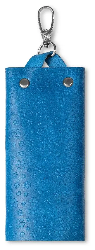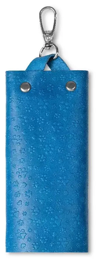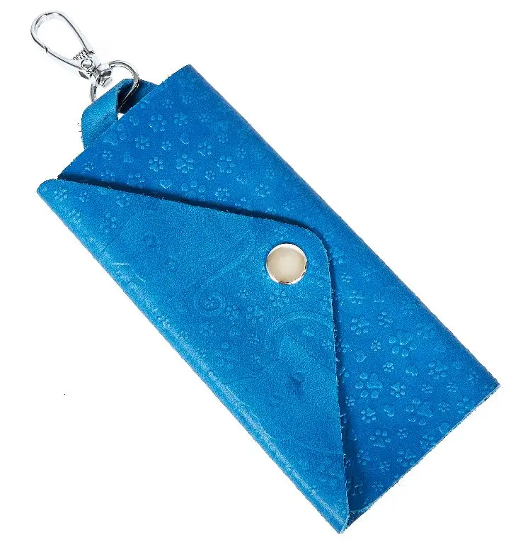 Ключница из натуральной кожи на кнопке, голубая, тиснение "Котики"