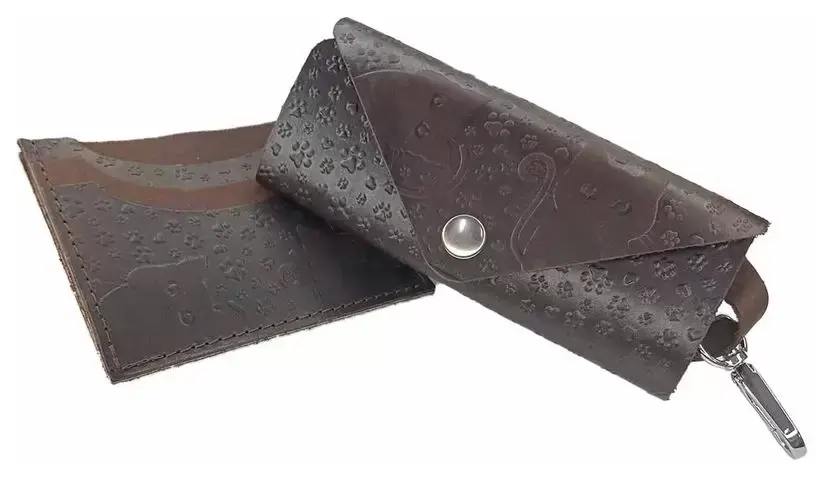 Ключница из натуральной кожи на кнопке, коричневая, тиснение "Котики"