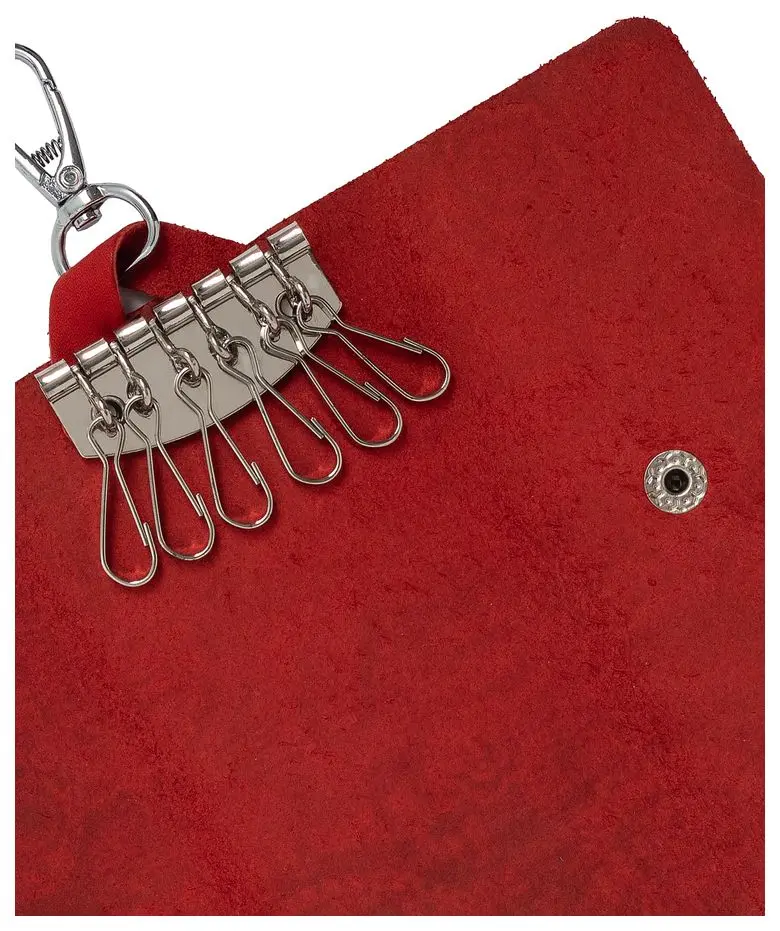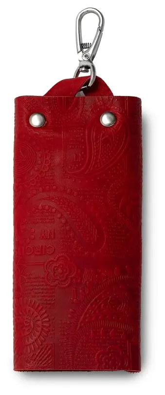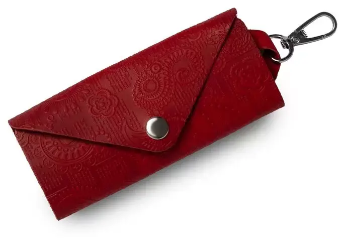 Ключница из натуральной кожи на кнопке, красная, тиснение "Индийский орнамент"
