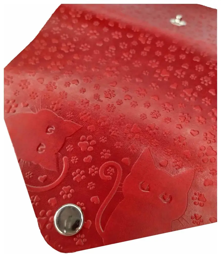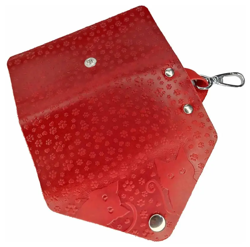 Ключница из натуральной кожи на кнопке, красная, тиснение "Котики"