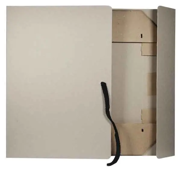 Складной короб "Отчет-архив" изготовлен из переплетного картона. Внутренние стойки выполнены из микрогофрокартона. В закрытом виде фиксируется с помощью двух хлопчатобумажных завязок. Ширина корешка - 70 мм. Внешние размеры 220х70х320 мм.