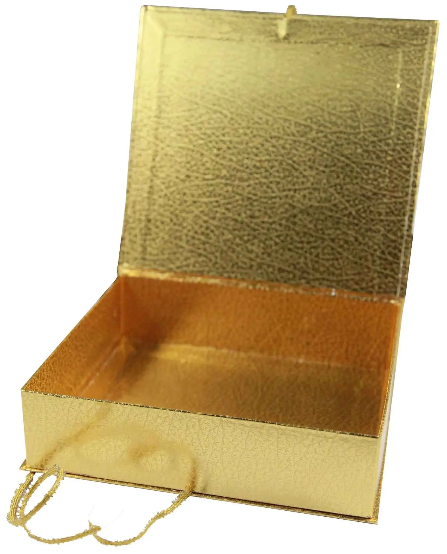 Коробка для подарков представительского уровня. Качественная и красивая. Выполнена из переплетного картона, кашированного переплетной бумагой золотого цвета и дополнена лентой в цвет коробки. Размер коробки 200*180*50 мм