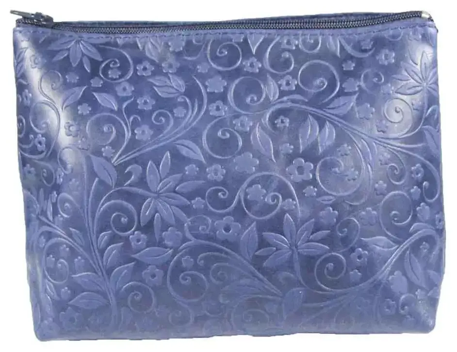 Косметичка из натуральной кожи 21x5x14 см, синяя, тиснение по коже конгрев "Флаверс", объемная