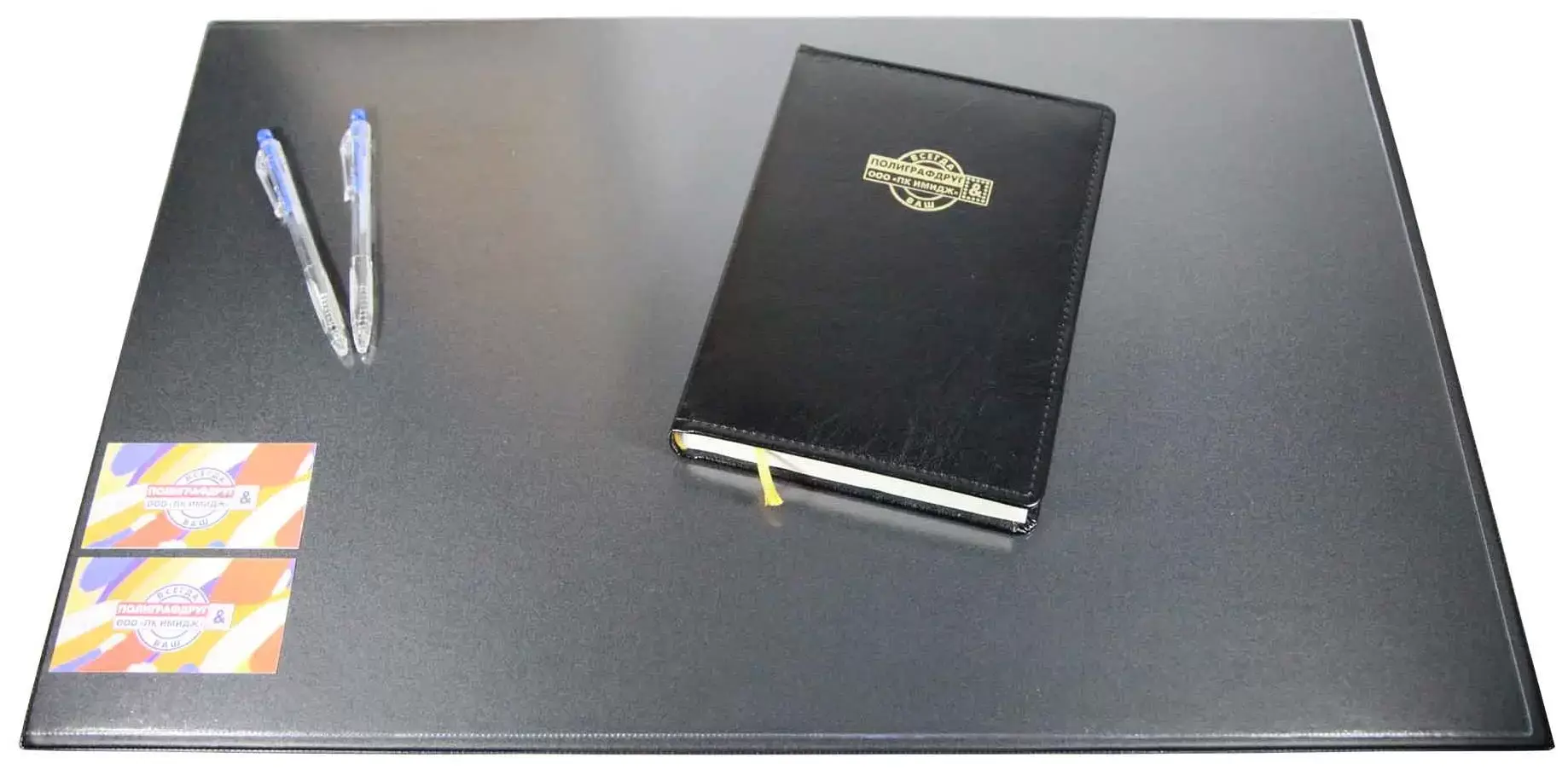 Настольный коврик выполнен из прочного картона и черного качественного ПВХ, с поднимающимся прозрачным верхним файлом. Под прозрачным файлом удобно размещать необходимую информацию. Размер коврика 590*380 мм. Прочный материал предохранит Ваш стол от разного рода повреждений и обеспечит удобство при письме.