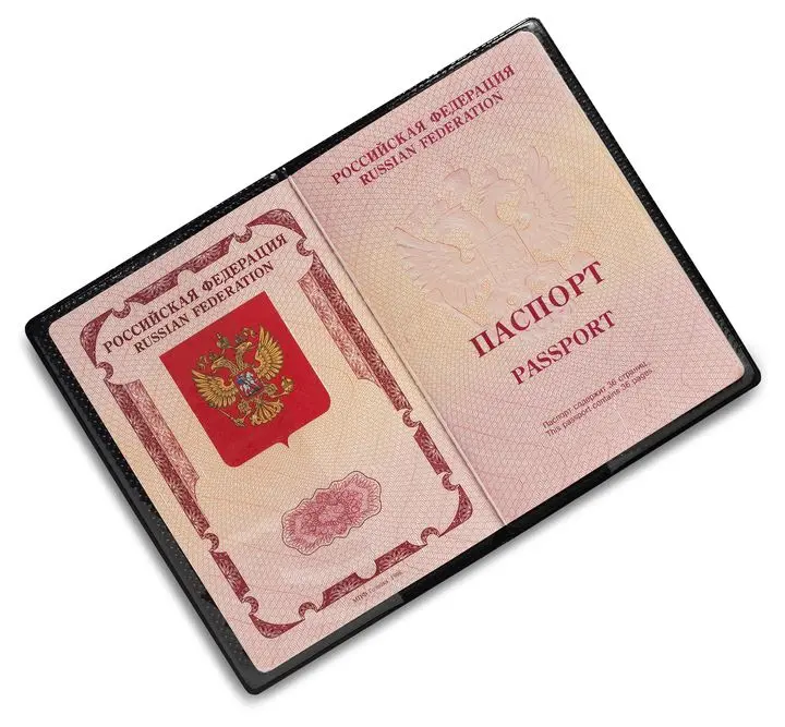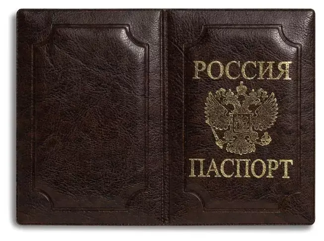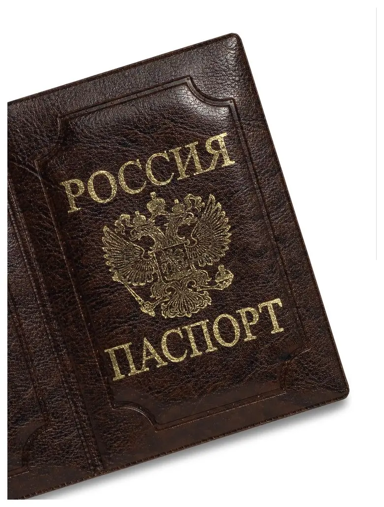 Обложка для паспорта вертикальная из искусственной кожи, выполнена в коричневом цвете. На лицевой стороне методом тиснения золотой фольгой нанесено изображение герба Российской Федерации и надпись "РОССИЯ" и "ПАСПОРТ".