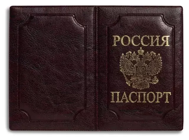 Обложка для паспорта вертикальная из искусственной кожи, выполнена в красном цвете. На лицевой стороне методом тиснения золотой фольгой нанесено изобраение герба Российской Федерации и надпись "РОССИЯ" и "ПАСПОРТ".