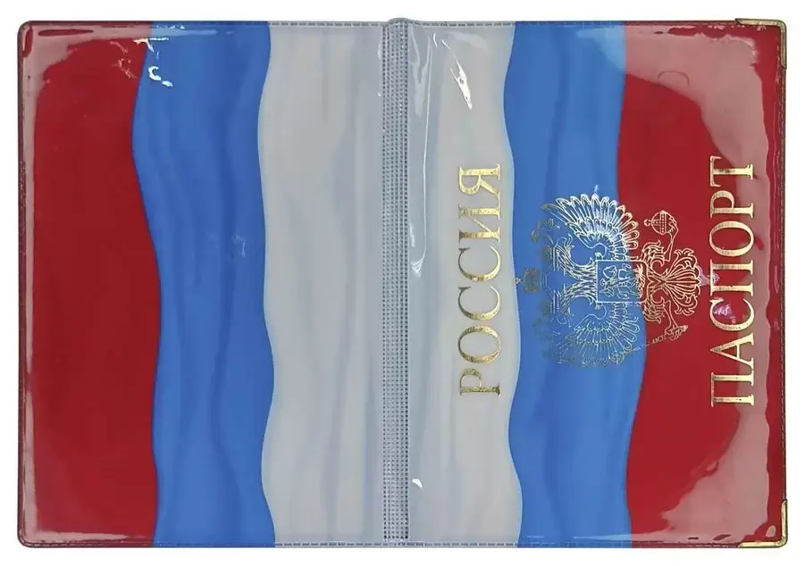 Горизонтальная глянцевая обложка для паспорта с двумя металлическими уголками. На лицевой стороне методом тиснения золотой фольгой нанесено изображение герба Российской Федерации и надпись "РОССИЯ" и "ПАСПОРТ".