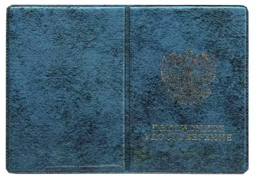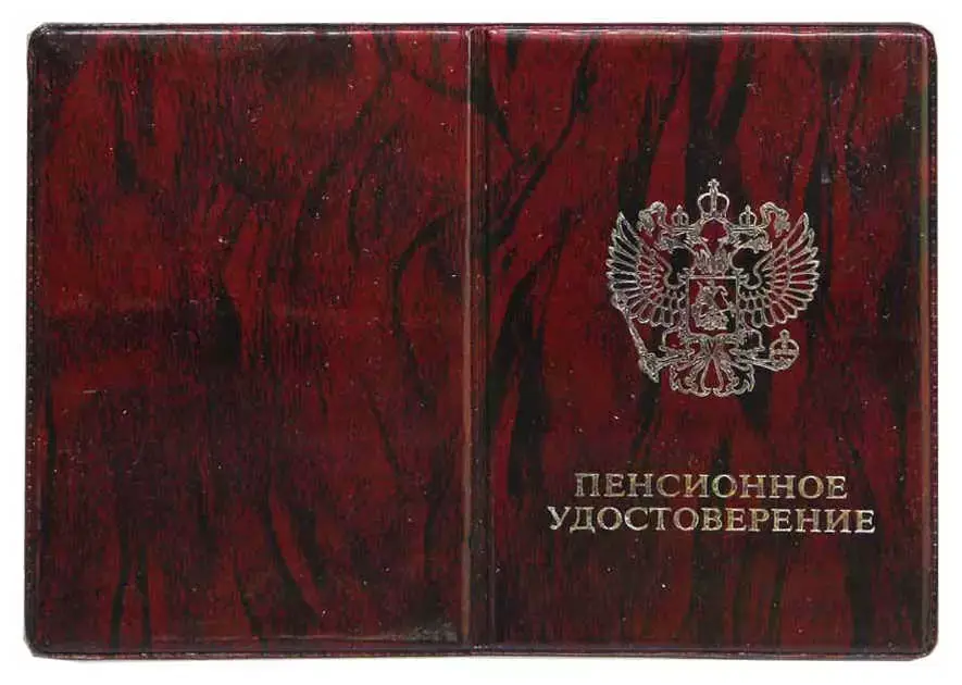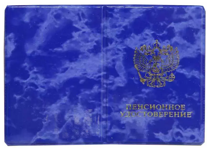 - Надпись (текст и рисунок): РОССИЯ, ПЕНСИОННОЕ УДОСТОВЕРЕНИЕ, Герб (Золотое тиснение)