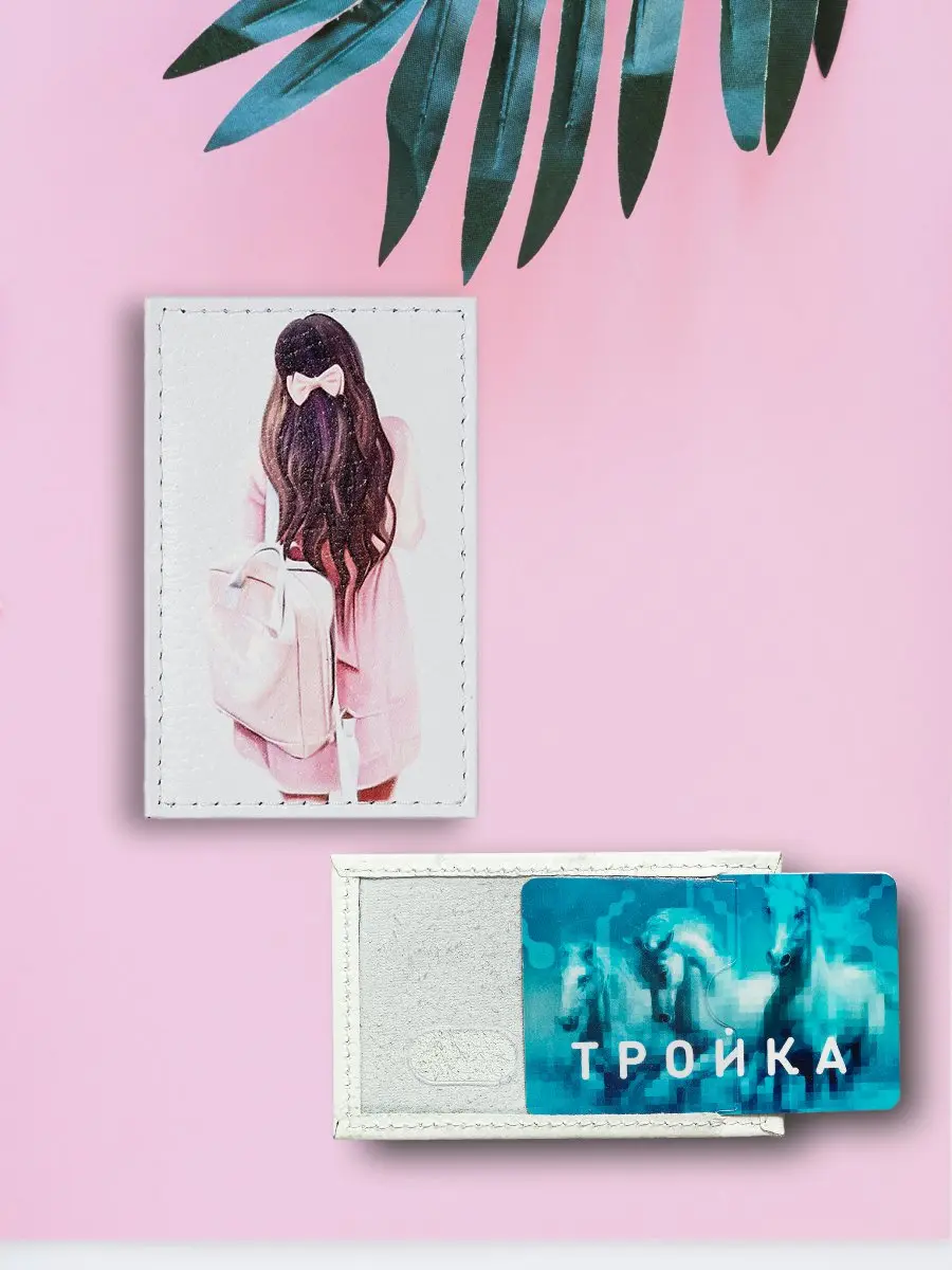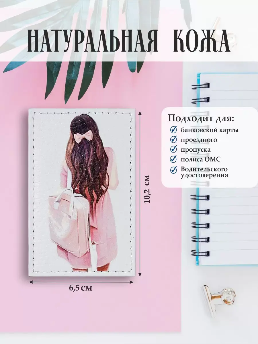 Обложка для проездного билета из натуральной кожи, цветной рисунок по коже "Зефирка"