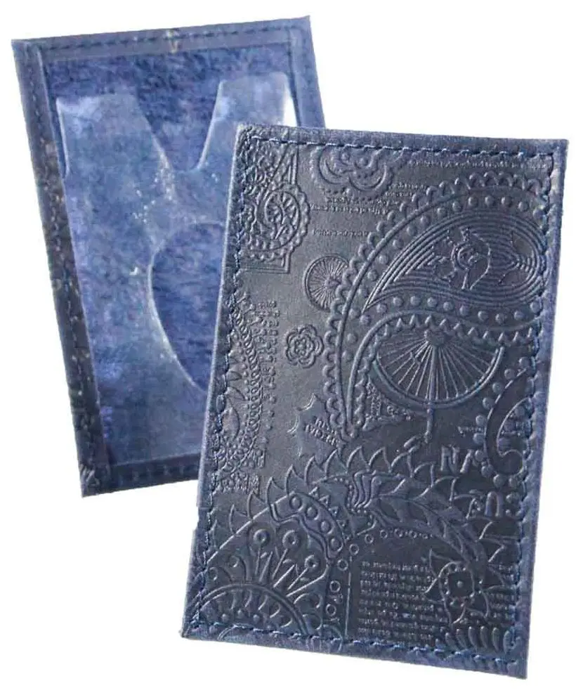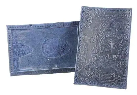 Обложка для проездного билета из натуральной кожи, синий, сплошное тиснение по коже "Индийский орнамент"