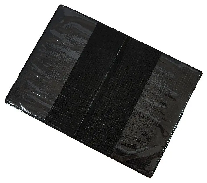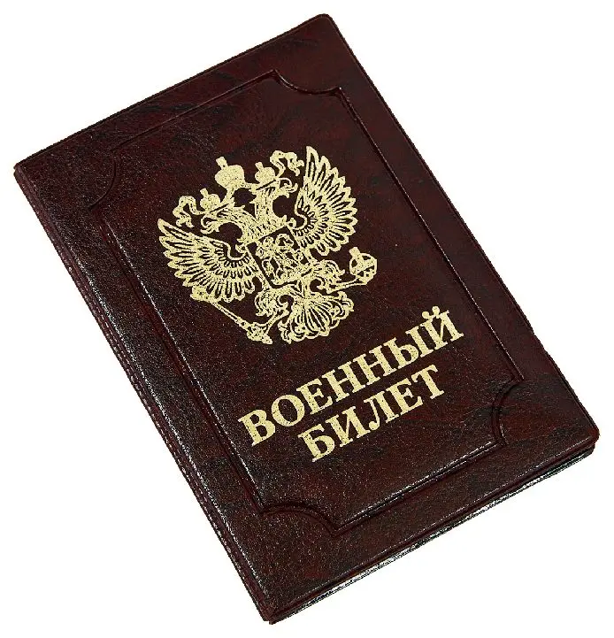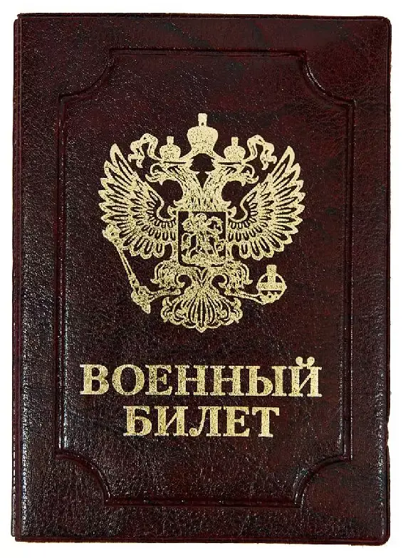 Обложка для военного билета из искусственной кожи, выполнена в красном цвете. На лицевой стороне методом тиснения золотой фольгой нанесено изображение герба Российской Федерации и надпись "ВОЕННЫЙ БИЛЕТ".