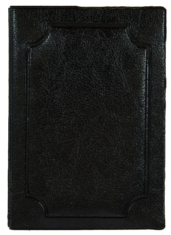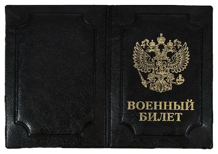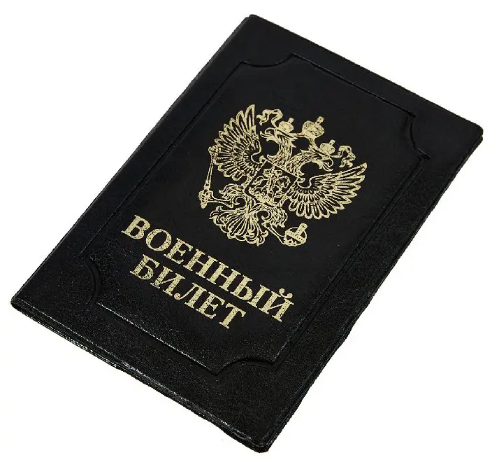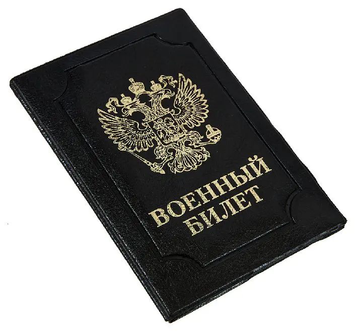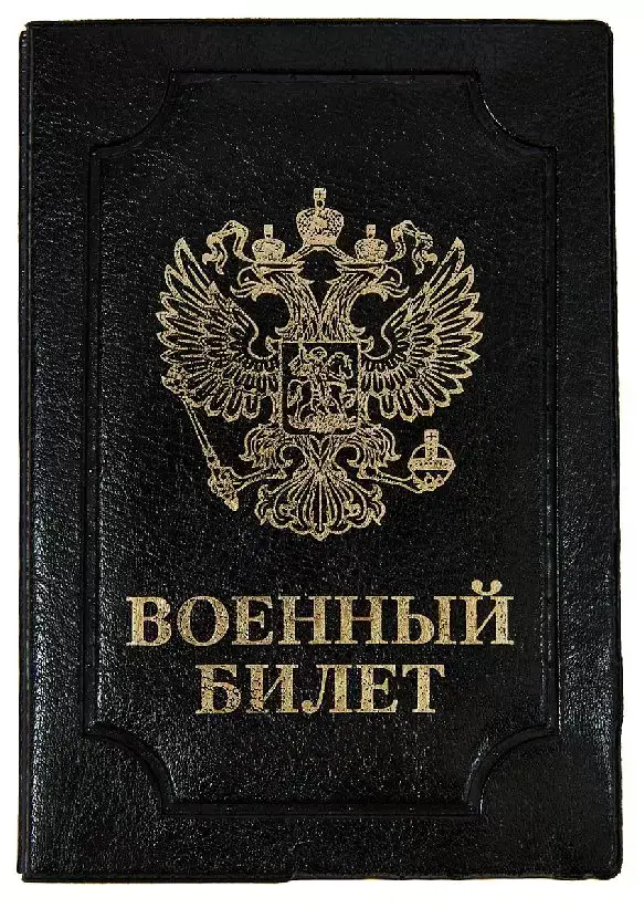 Обложка для военного билета из искусственной кожи, выполнена в черном цвете. На лицевой стороне методом тиснения золотой фольгой нанесено изображение герба Российской Федерации и надпись "ВОЕННЫЙ БИЛЕТ".