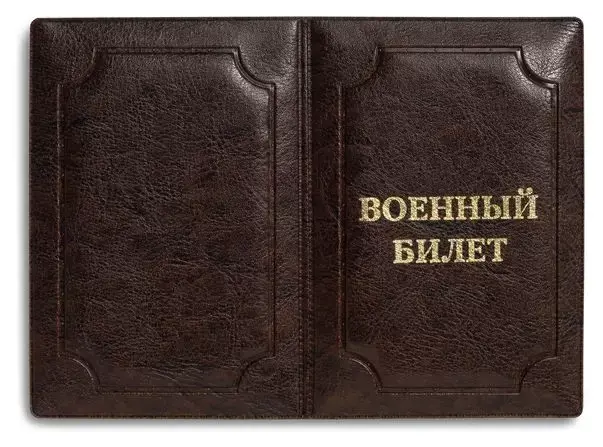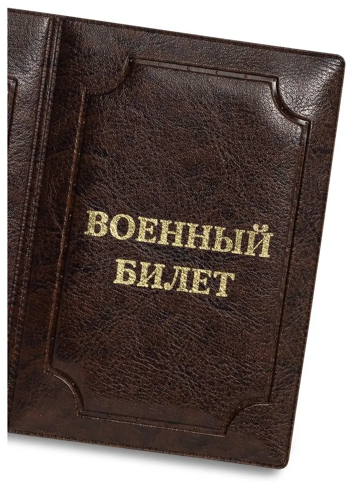 Обложка для военного билета из искусственной кожи, выполнена в коричневом цвете. На лицевой стороне методом тиснения золотой фольгой нанесена надпись "ВОЕННЫЙ БИЛЕТ".