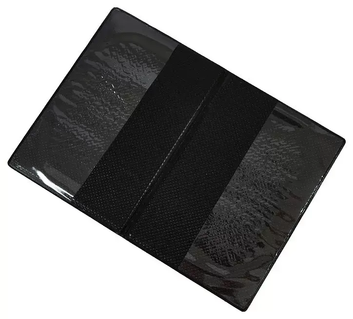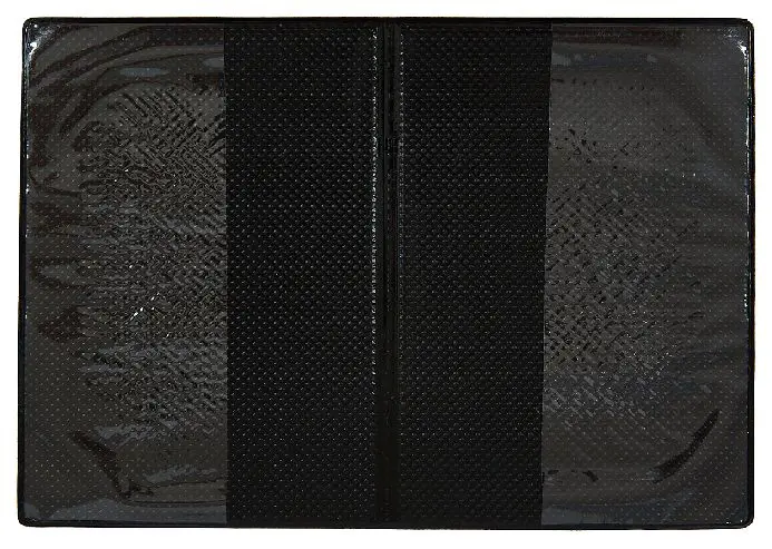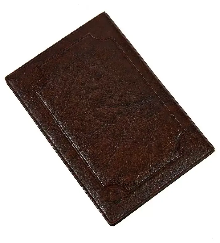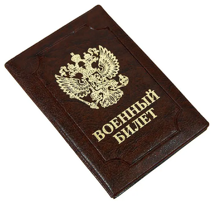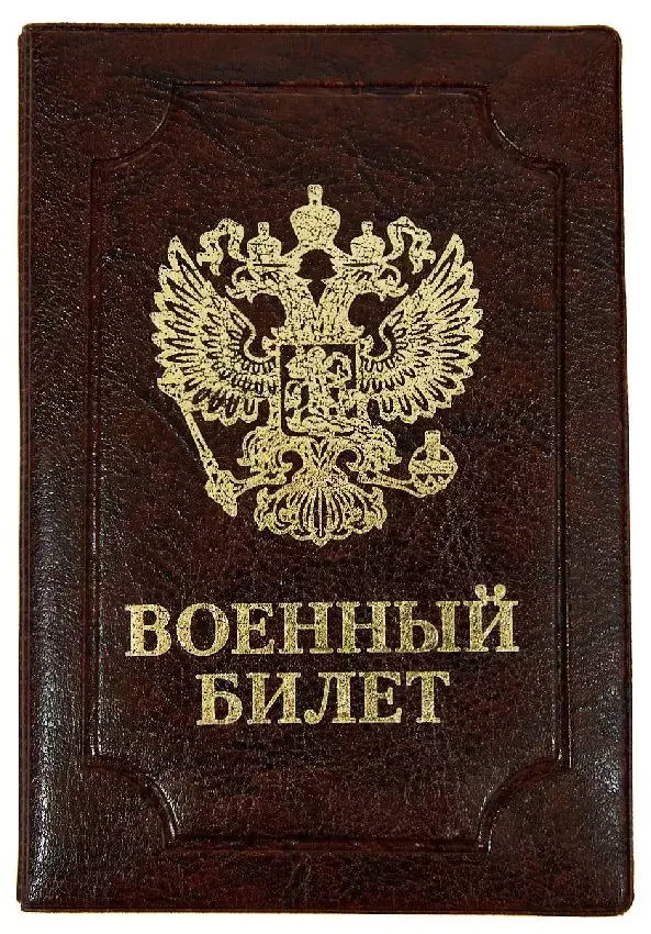 Обложка для военного билета из искусственной кожи, выполнена в коричневом цвете. На лицевой стороне методом тиснения золотой фольгой нанесено изображение герба Российской Федерации и надпись "ВОЕННЫЙ БИЛЕТ".