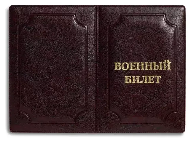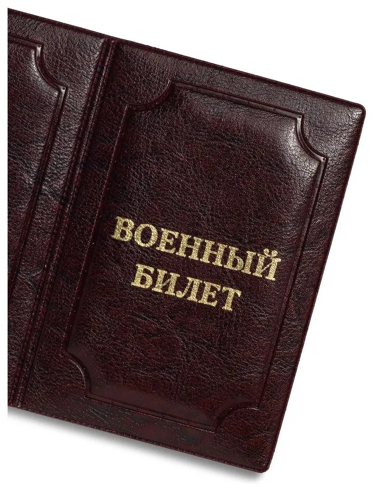 Обложка для военного билета из искусственной кожи, выполнена в красном цвете. На лицевой стороне методом тиснения золотой фольгой нанесена надпись "ВОЕННЫЙ БИЛЕТ".