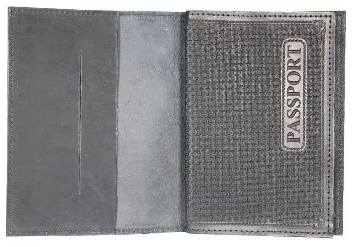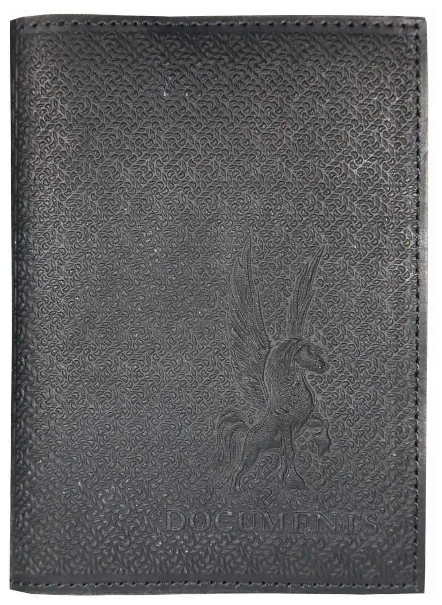 Обложка вертикальная,универсальная для паспорта и автодокументов из натуральной кожи. Выполнена в сдержанных серо-черных тонах способом художественного тиснения с эффектом рельефной кожи. На лицевой стороне в правом нижнем углу изображение пегаса, под ним надпись "DOCUMENTS". Внутри обложки есть кармашек, предназначенный для вкладыша под автодокументы и отделение для паспорта, выполненное в том же стиле рельефной кожи с надптсью "PASSPORT".
