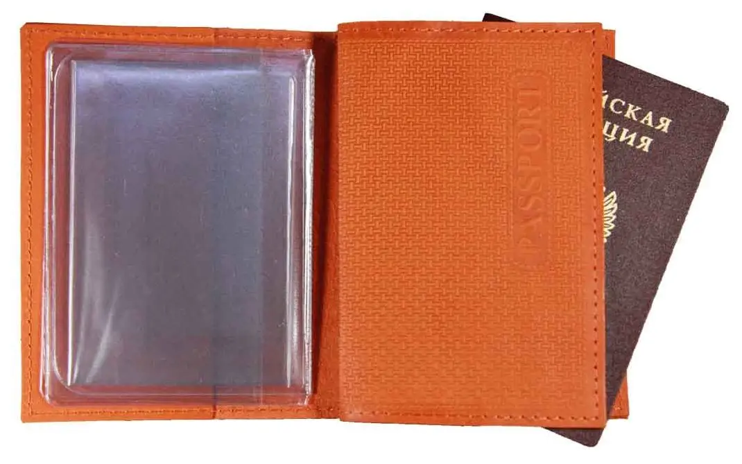 Обложка вертикальная,универсальная для паспорта и автодокументов из натуральной кожи. Выполнена в рыжем цвете способом художественного тиснения с эффектом рельефной кожи. На лицевой стороне в правом нижнем углу изображение пегаса, под ним надпись "DOCUMENTS". Внутри обложки есть кармашек, предназначенный для вкладыша под автодокументы и отделение для паспорта, выполненное в том же стиле рельефной кожи с надптсью "PASSPORT".
