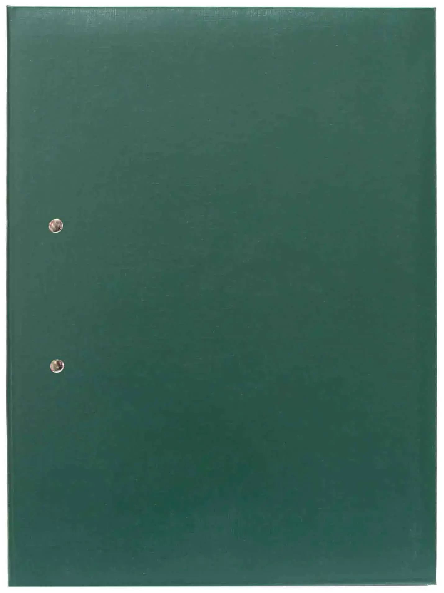 Папка адресная формата А4 (пухлая) с металлическим прижимным механизмом для бережного хранения документов без перфорации. Изготовлена из зеленого бумвинила с жестким корешком 20 мм. Внутри папка выклеена белой офсетной бумагой.