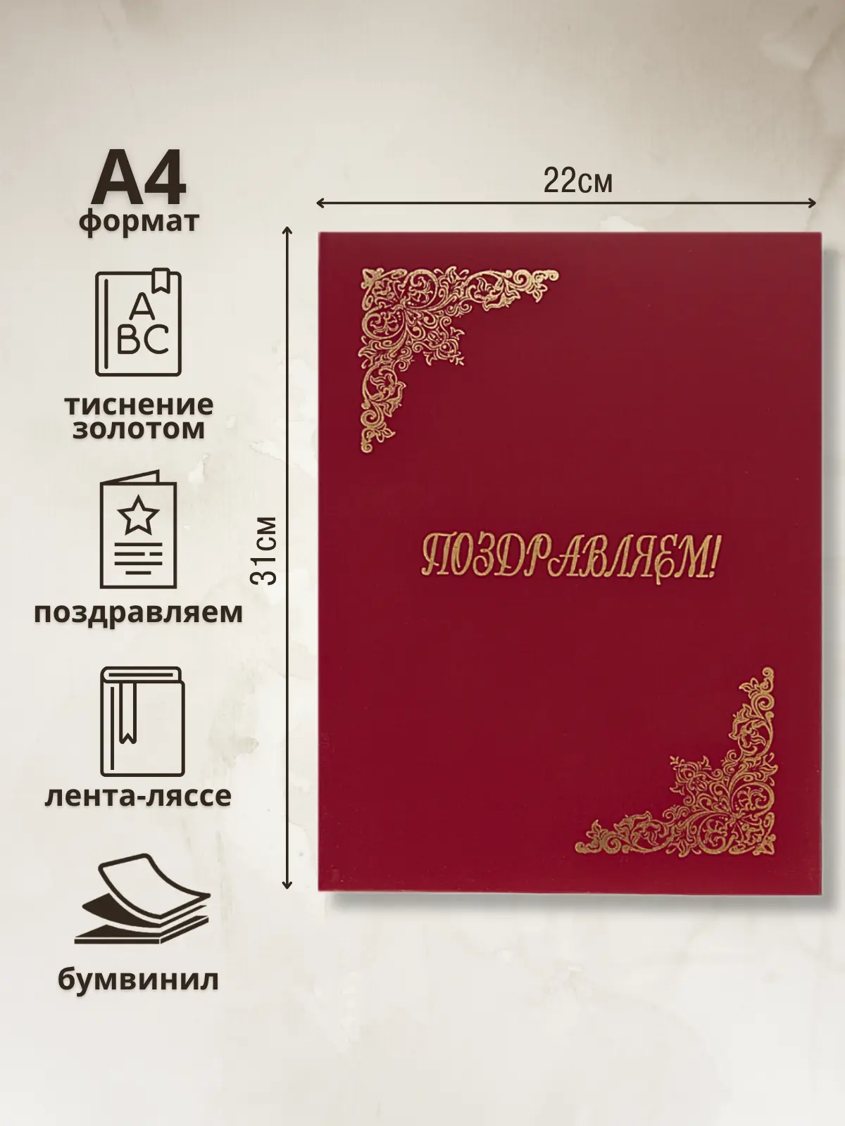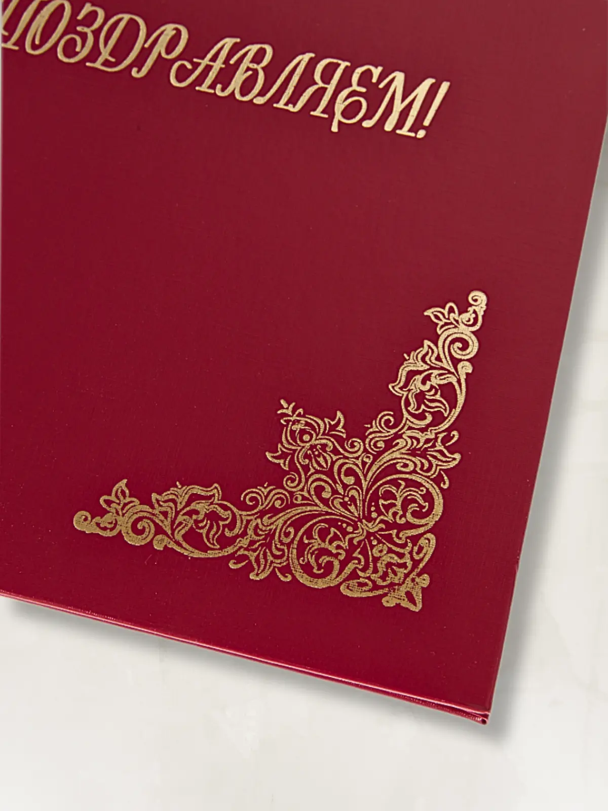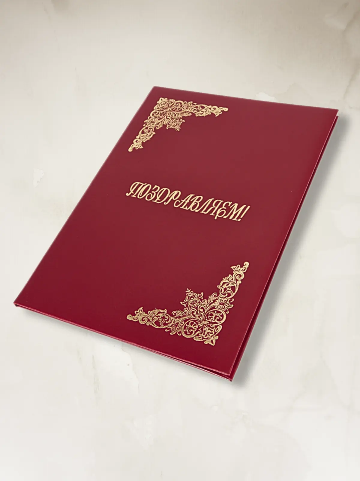 Адресная папка мягкая формата А4 изготовлена из бумвинила бордового цвета. Внутренние вклейки — белая офсетная бумага. На обложку методом тиснения золотой фольгой нанесена надпись. Адресная папка подходит для поздравлений.