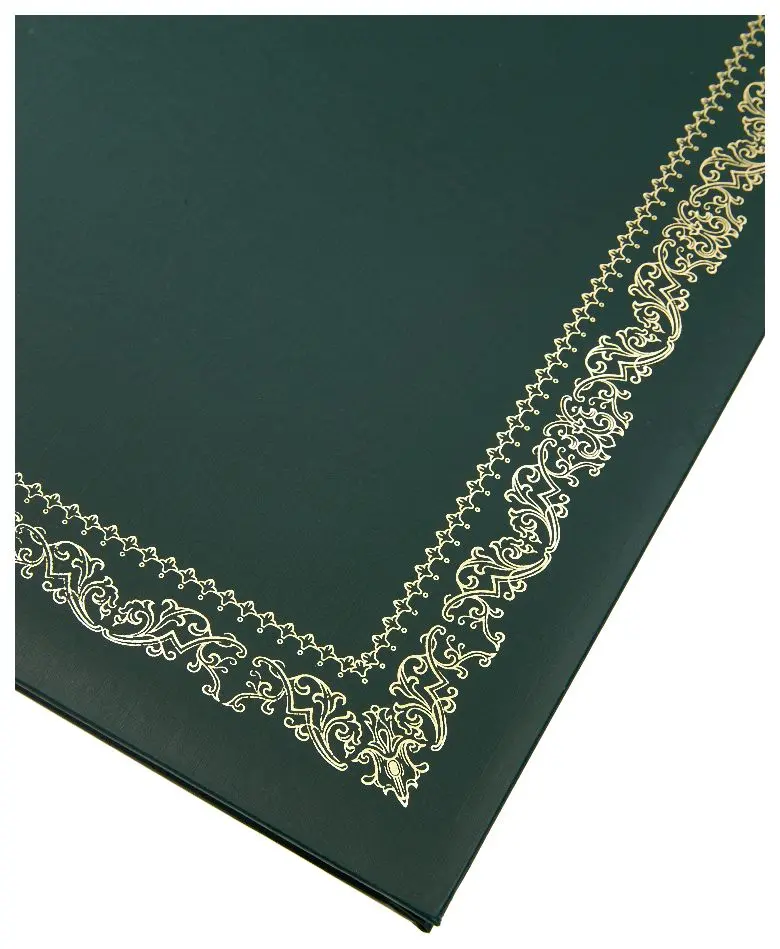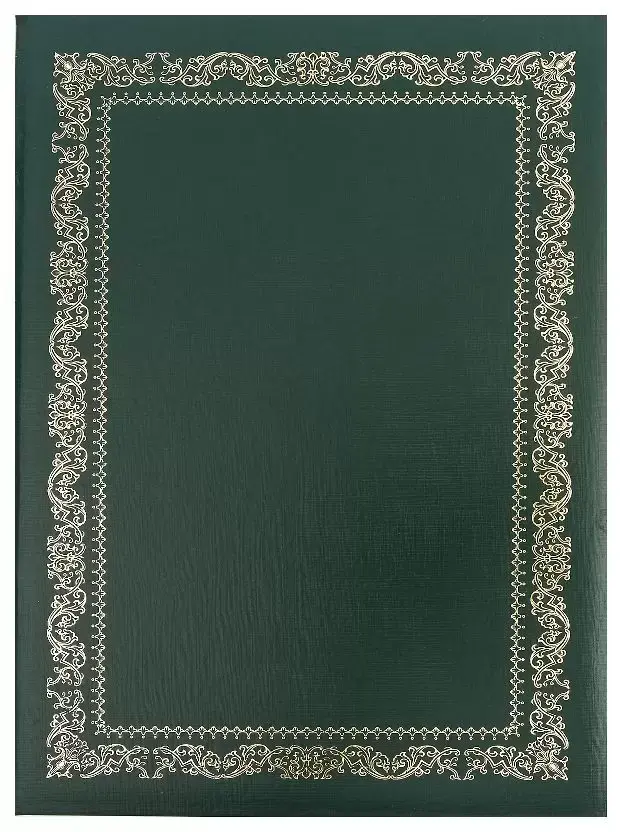 Адресная папка мягкая формата А4 изготовлена из бумвинила зеленого цвета. Внутренние вклейки — белая офсетная бумага. На обложку методом тиснения золотой фольгой нанесена рамка. Адресная папка подходит для поздравлений, хранения документов, а также подачиих на подпись.