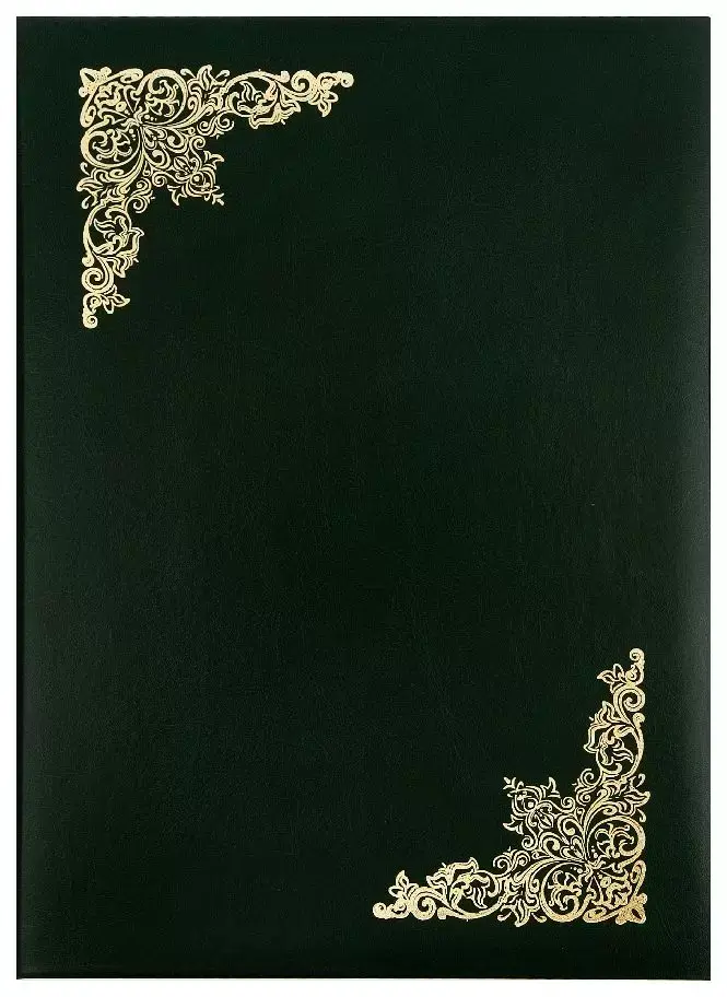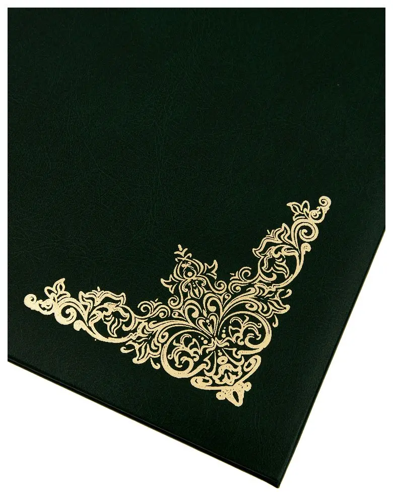 Адресная папка мягкая формата А4 изготовлена из бумвинила зеленого цвета, с разводами. Внутренние вклейки — белая офсетная бумага. На обложку методом тиснения золотой фольгой нанесена надпись. Адресная папка подходит для поздравлений, хранения документов, а также подачи их на подпись.