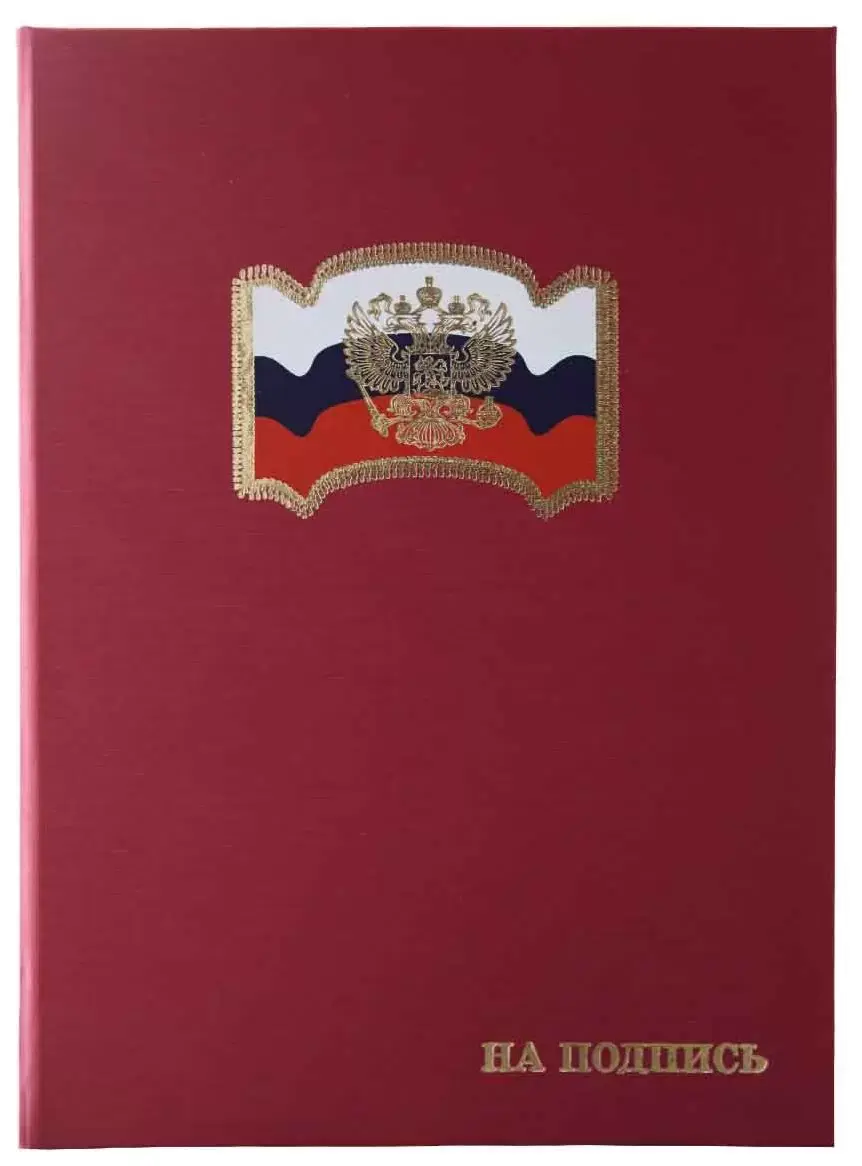 Папка адресная дизайнерские материалы "С Российским флагом и орлом" А4 (пухлая) "На подпись" шелк красный