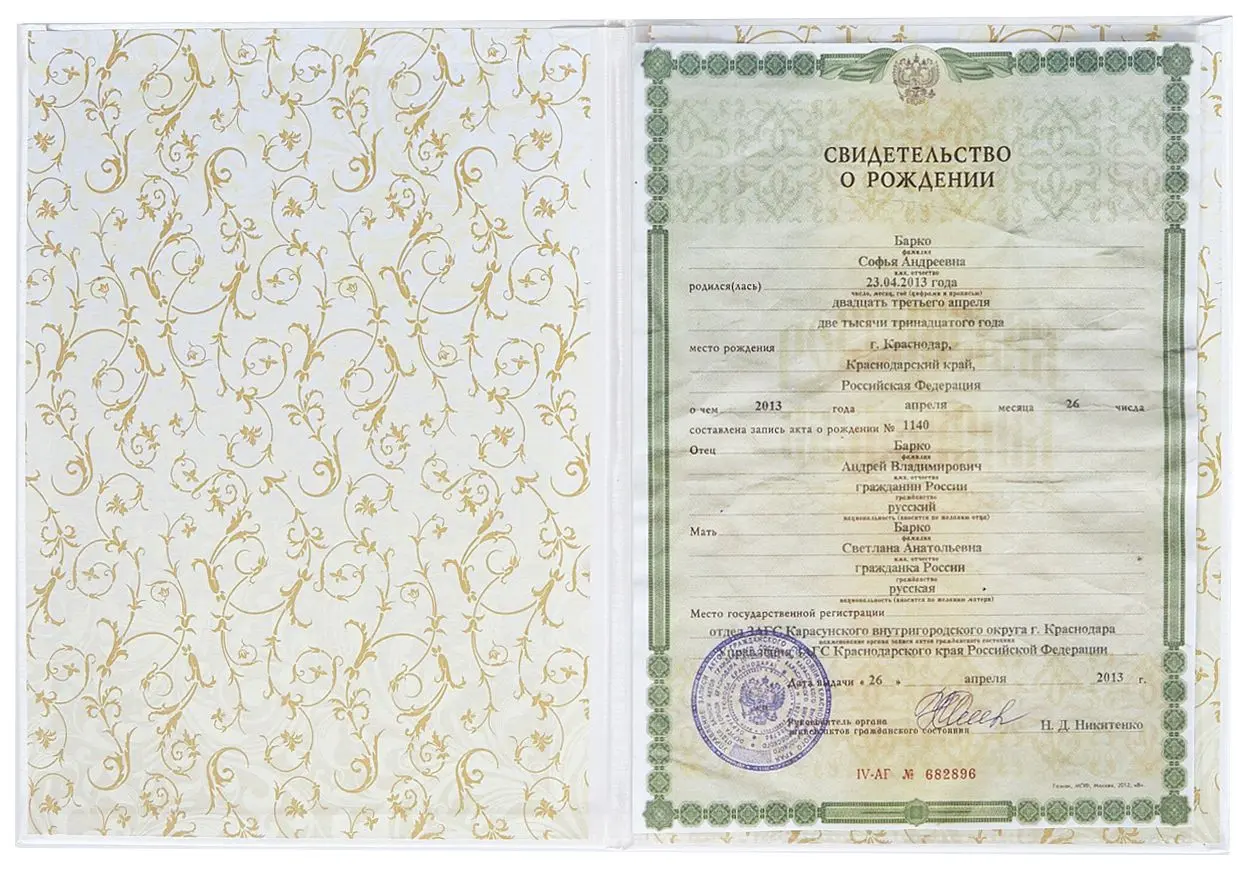 - Надпись (текст и рисунок): Свидетельство о рождении