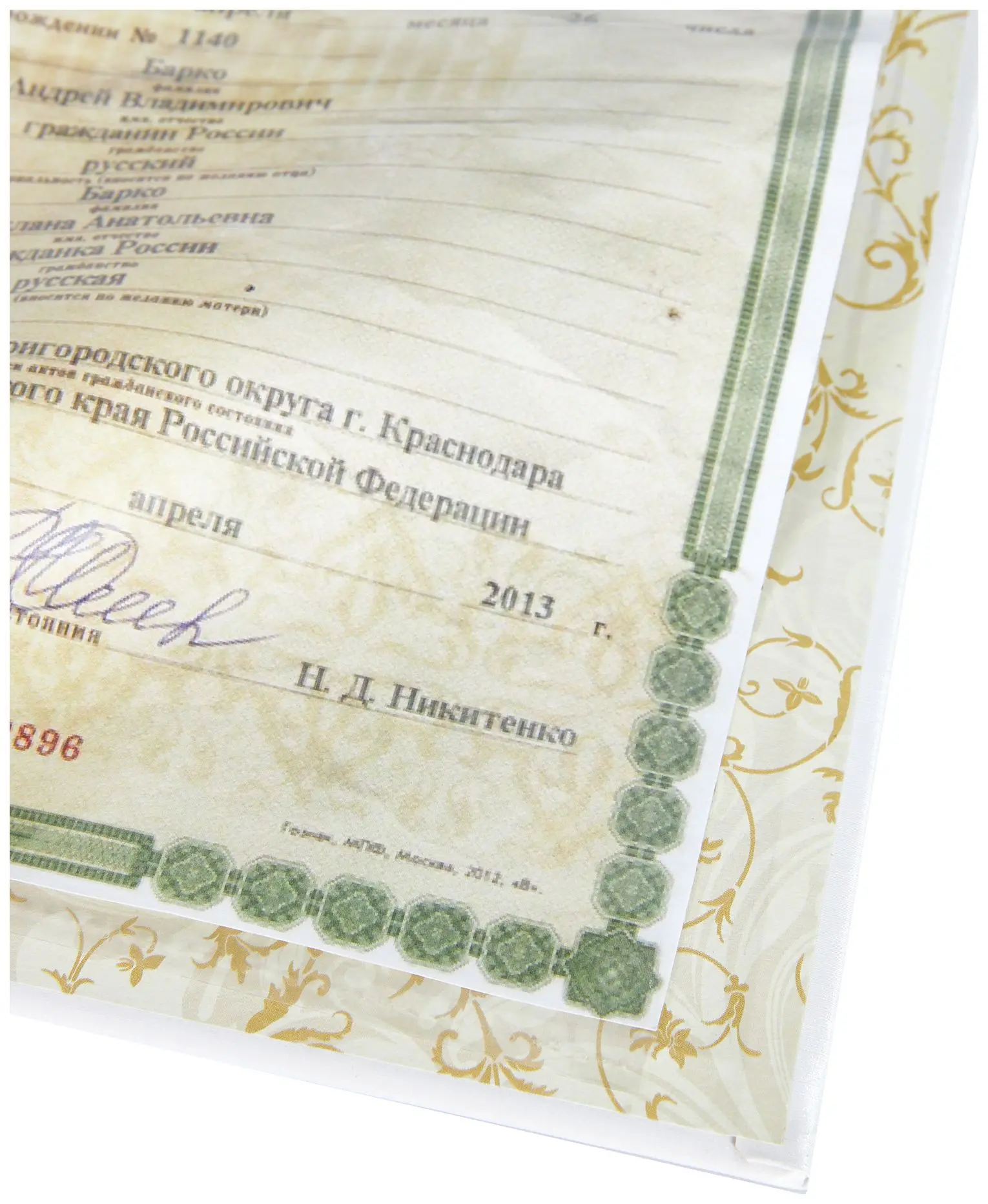 Папка с файлом дизайнерские переп.материалы А4 (пухлая) "Свидетельство о рождении с виньеткой" шелк белый