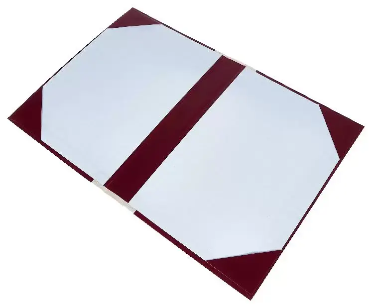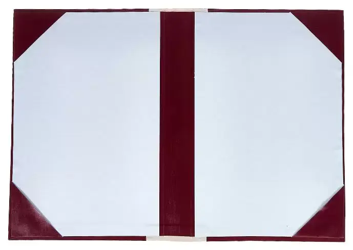 Папка жесткая, изготовлена из бордового бумвинила с мягким корешком 40 мм , выполненным из коленкора.