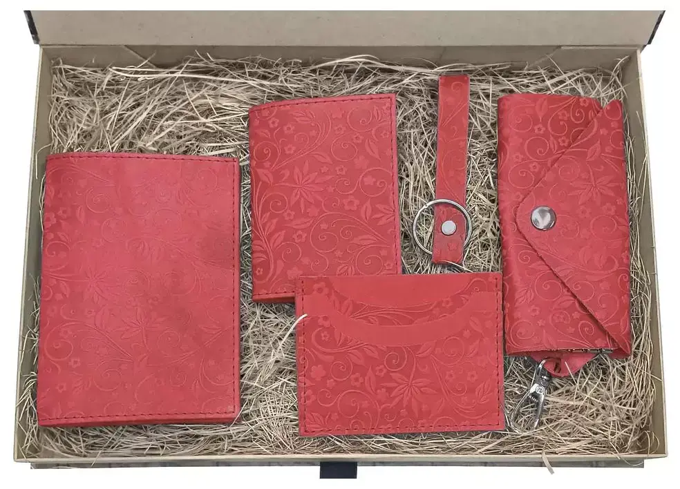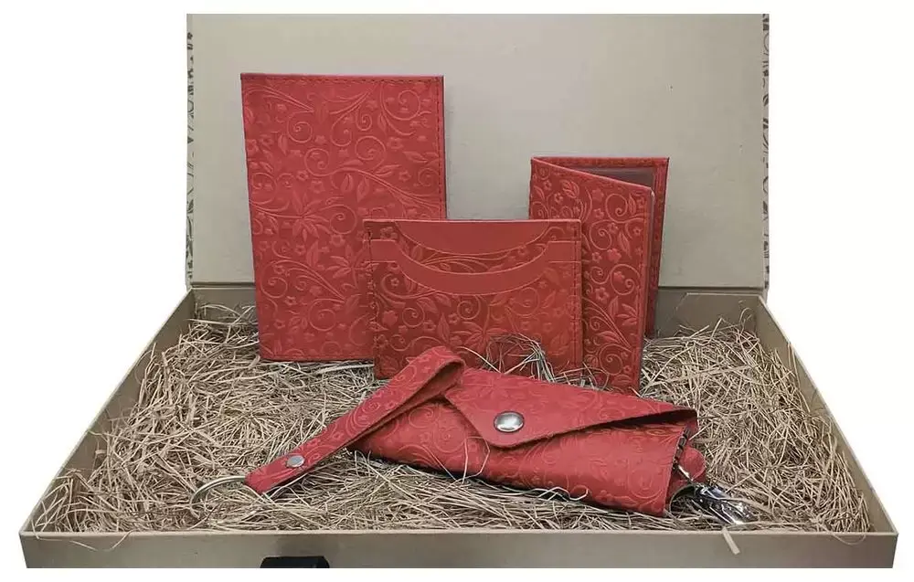 Подарочный набор "Бомонд" из натуральной кожи, красный, тиснение "Флаверс"