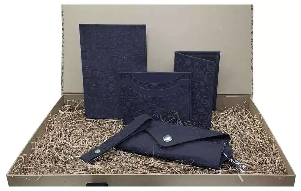Подарочный набор "Бомонд" из натуральной кожи, синий, тиснение "Флаверс"
