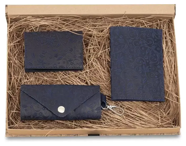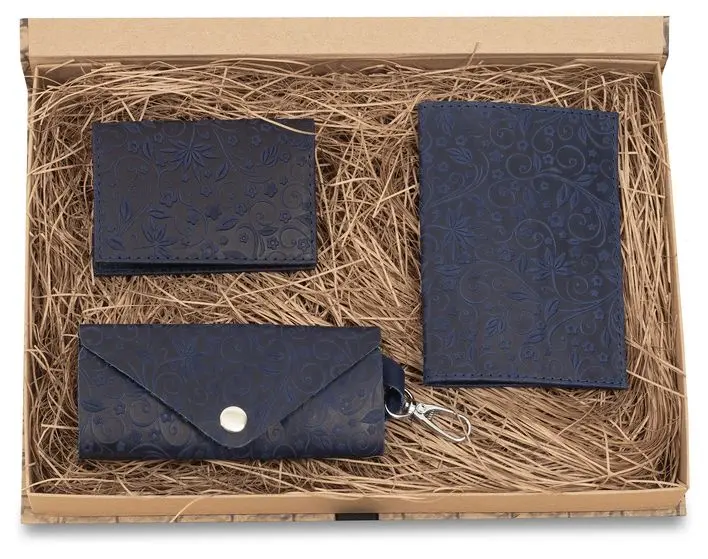 Подарочный набор "Классик" из натуральной кожи, синий, тиснение "Флаверс"
