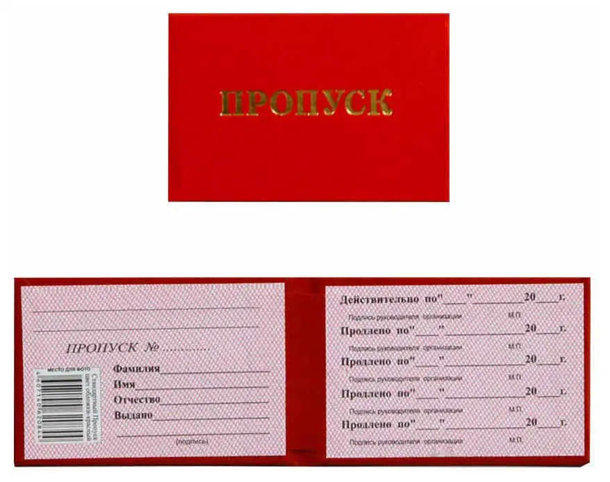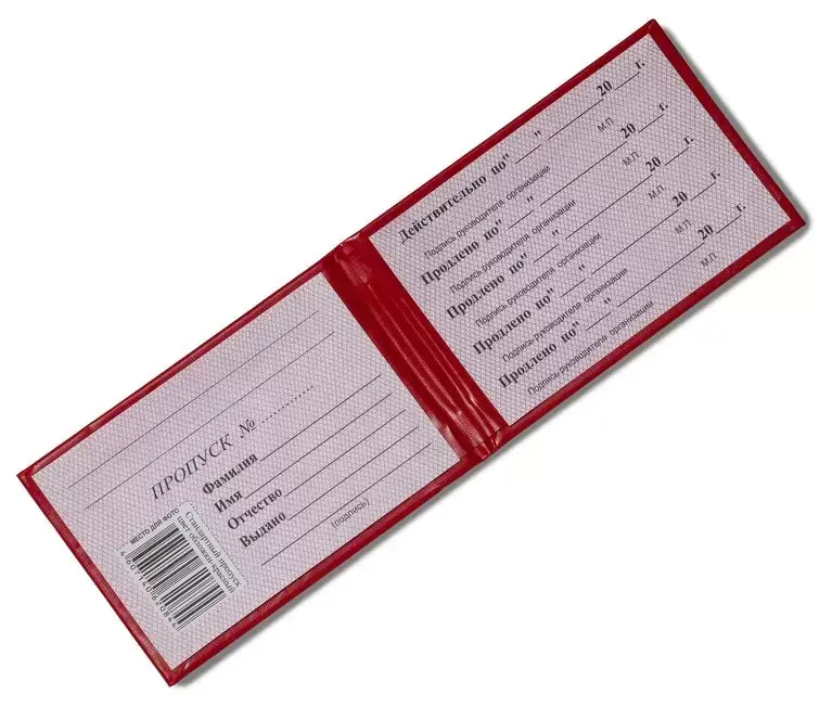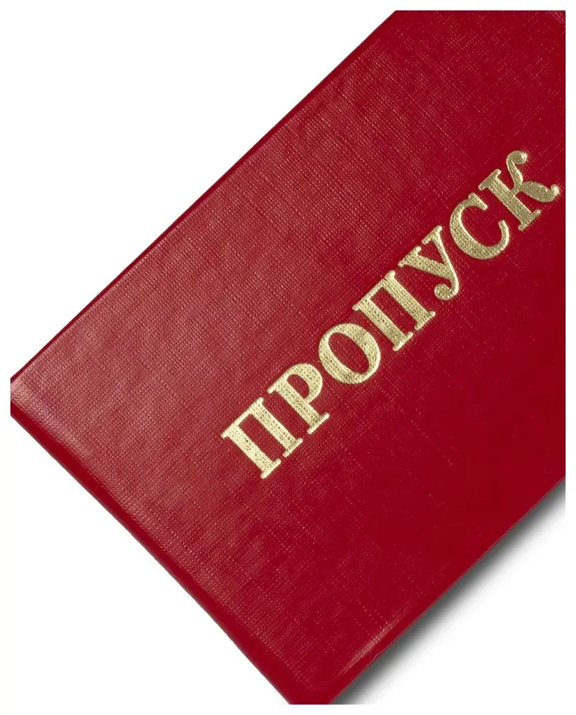 Пропуск в жесткой обложке 95*65 мм. Переплет изготовлен из красного бумвинила, надпись "ПРОПУСК" выполнена золотым тиснением. Внутри бланк имеет бумажную вклейку для заполнения и место для фотографии .