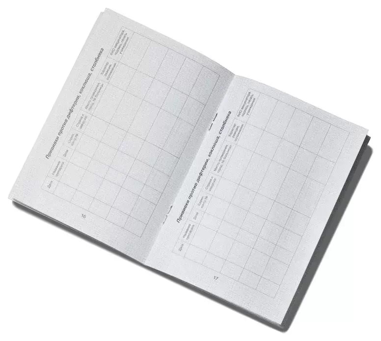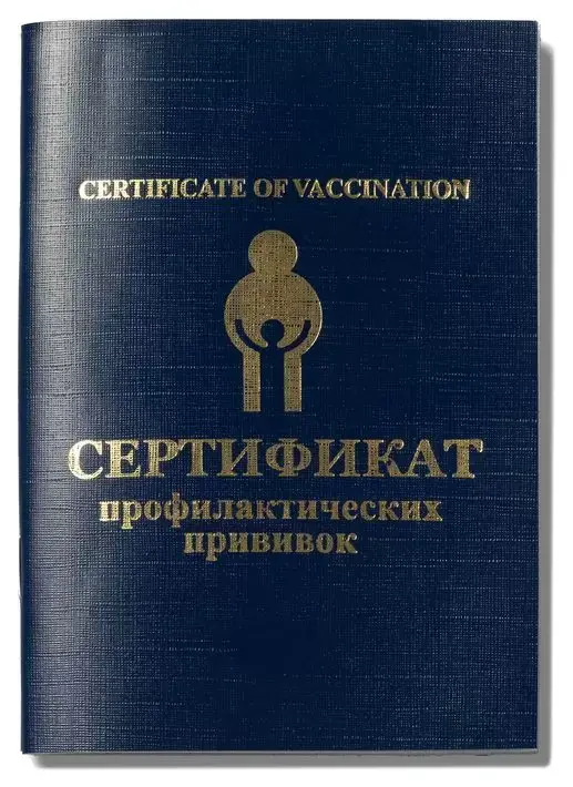 Сертификат профилактических прививок, обложка из синего бумвинила. На лицевой стороне надпись " Сертификат профилактических прививок", выполнена золотым тиснением. Внутри блок для записей о прохождении прививок.