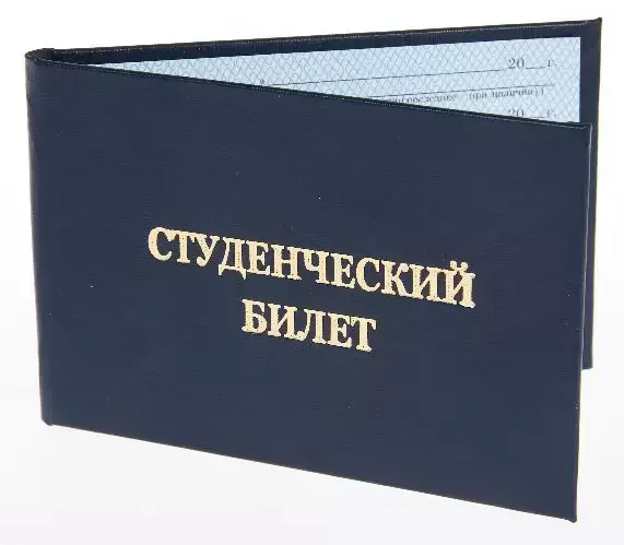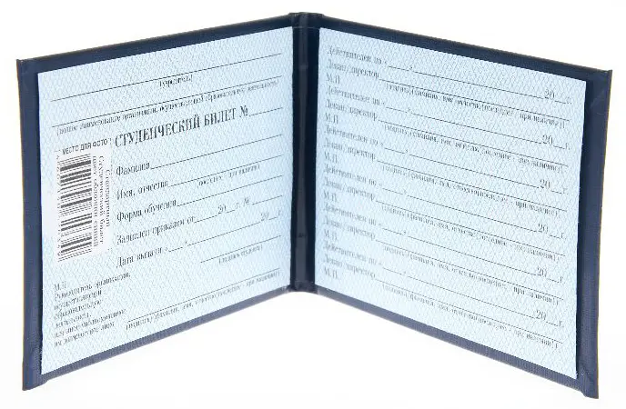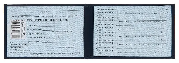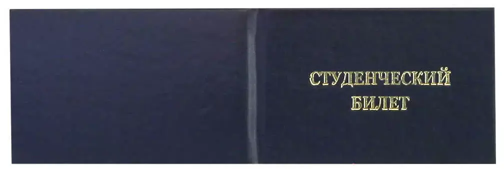 Студенческий билет в жесткой обложке 95*65 мм. Переплет изготовлен из синего бумвинила, надпись "СТУДЕНЧЕСКИЙ БИЛЕТ" выполнена золотым тиснением. Внутри бланк имеет бумажную вклейку для заполнения и место для фотографии.