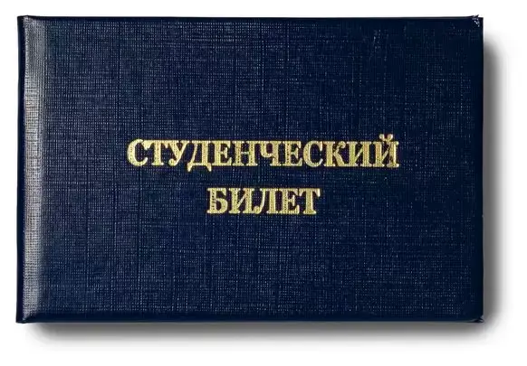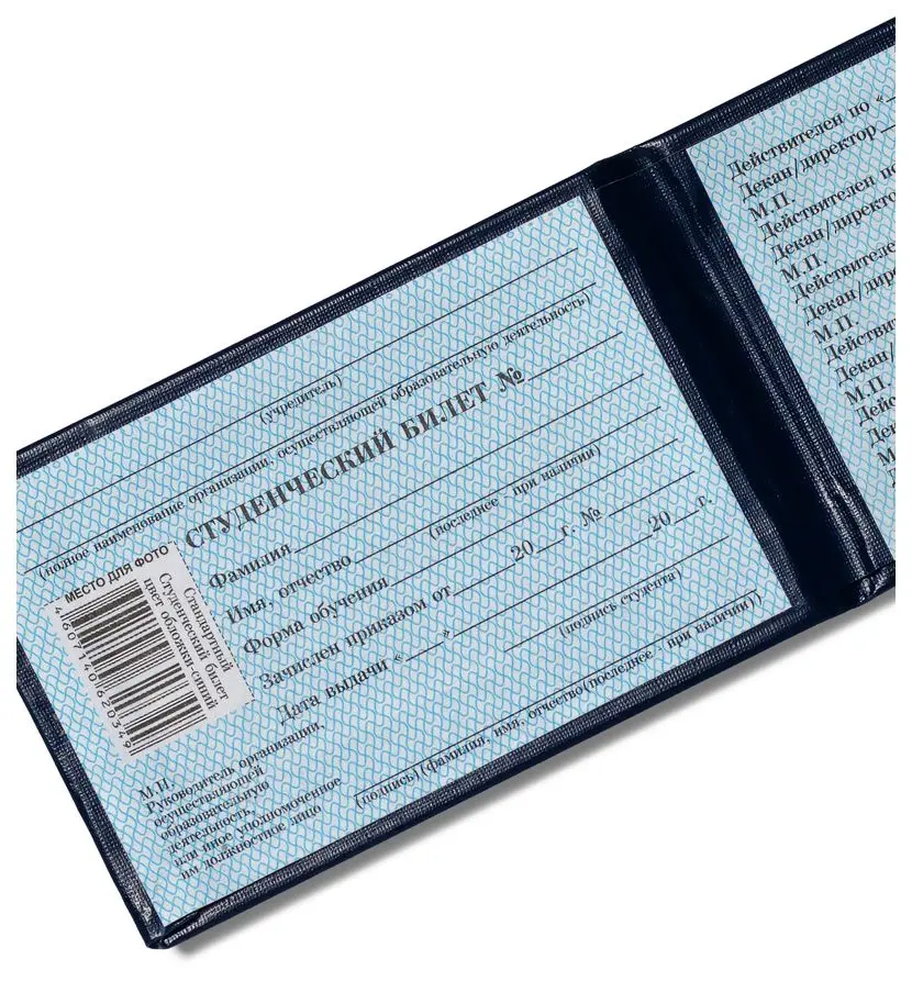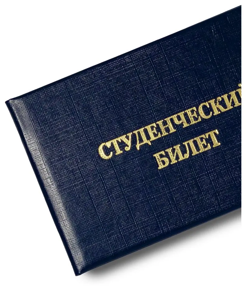 Студенческий билет в жесткой обложке 95*65 мм. Переплет изготовлен из синего бумвинила, надпись "СТУДЕНЧЕСКИЙ БИЛЕТ" выполнена золотым тиснением. Внутри бланк имеет бумажную вклейку для заполнения и место для фотографии.