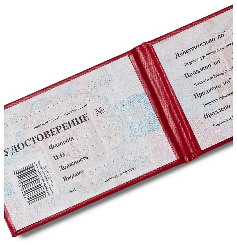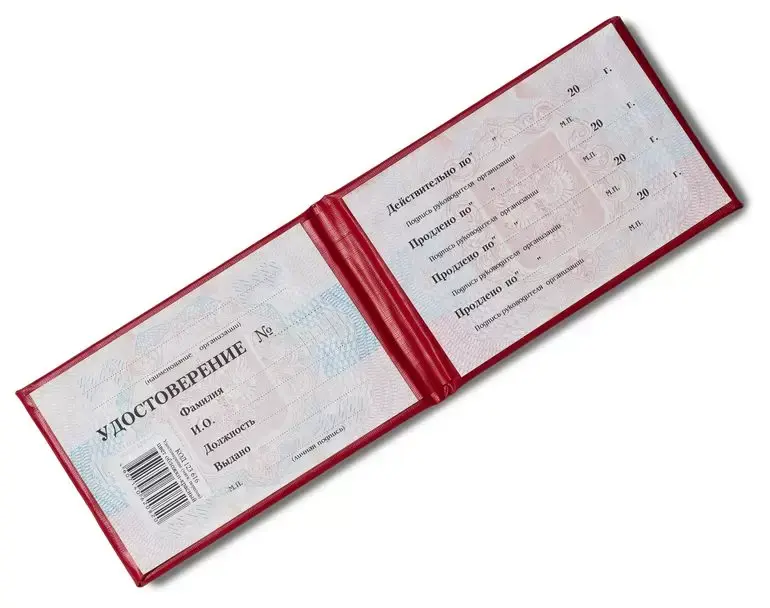 Удостоверение в мягкой обложке 95*65 мм. Переплет изготовлен из красного бумвинила. На лицевой стороне изображение Герба Российской Федерации,под ним надпись "УДОСТОВЕРЕНИЕ", выполненные золотым тиснением. Внутри бумажная вклейка для заполнения и место для фото, выполненная с цветным изображением Герба и флага Российской Федерации.