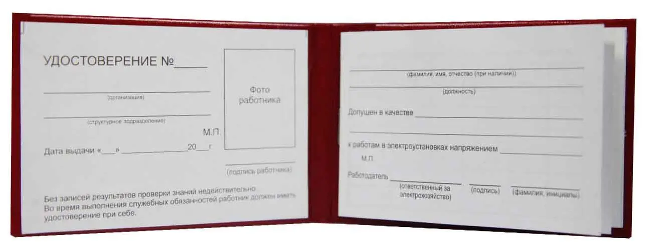 Удостоверение о проверке правил работы в электроустановках (жесткое), бумвинил, бордовый, с тиснением, 95*65 мм
