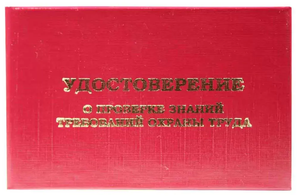 Удостоверение в жесткой обложке 95*65 мм. Переплет изготовлен из бодового бумвинила. На лицевой стороне надпись "Удостоверение о проверке знаний требований охраны труда", выполнена золотым тиснением. Внутри бумажная вклейка для заполнения.