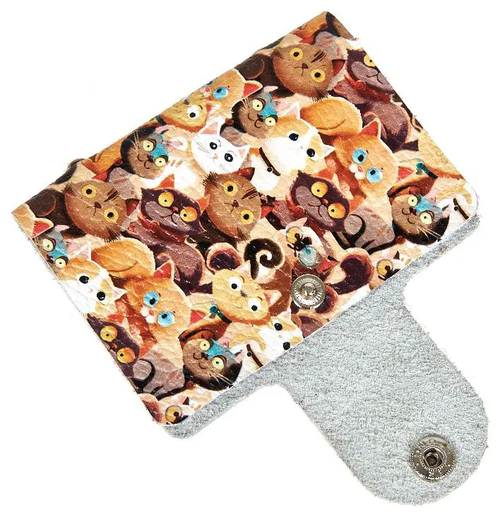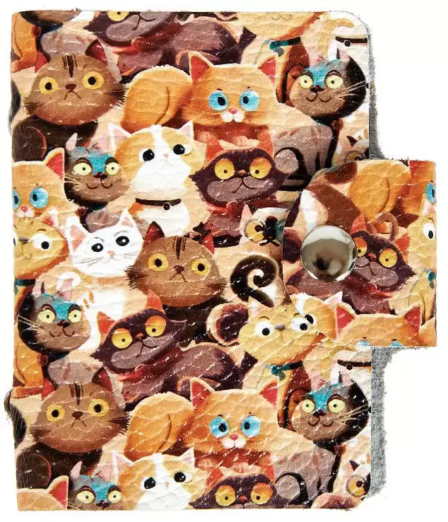 Визитница вертикальная 1 секц. (18 карманов) из натуральной кожи, на кнопке, цветной рисунок по коже "Пушистики"